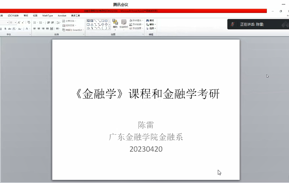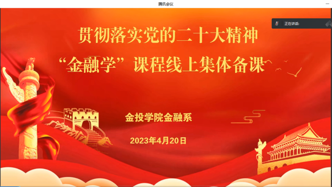 为了贯彻落实党的二十大精神,助力金投公司实现高质量发展的工作目标,beet365《金融学》课程组于2023年4月20日晚上八点通过腾讯会议举行了线上集体备课会,公司副经理刘昊虹、李日新、金融系主任王颖、副主任林梨奎以及王梅、石巧荣、周向雯、欧阳敏、程华强、饶华春、林力、鲁细根、吕建、陈雷、罗娟、刘璨、张婷希、曹昱葭、杨睿博、向海淩、韦璐、钱崇秀、李子文、王纯洁、罗丽萍、林爱杰、李心雅、吴丽鹂、王浩楠等29位授课老师参加了本次备课会。会议由王颖主任主持,并邀请程华强博士、周向雯副教授、陈雷博士等教学骨干老师重点介绍金融学的教学大纲、重点难点、教学方法及考研知识点。