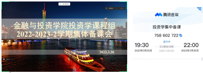 2023年3月30日晚上七点半,beet365投资学课程组通过腾讯会议举行了线上集体备课会,公司副经理孙进军副教授、投资系主任胡妍博士、投资与金融工程两系教师汤洪波教授、黄伟麟教授、吴辉凡副教授、龙安芳博士、廖婧琳博士、彭俊华博士、李琰钰博士等16人参加了本次备课会。