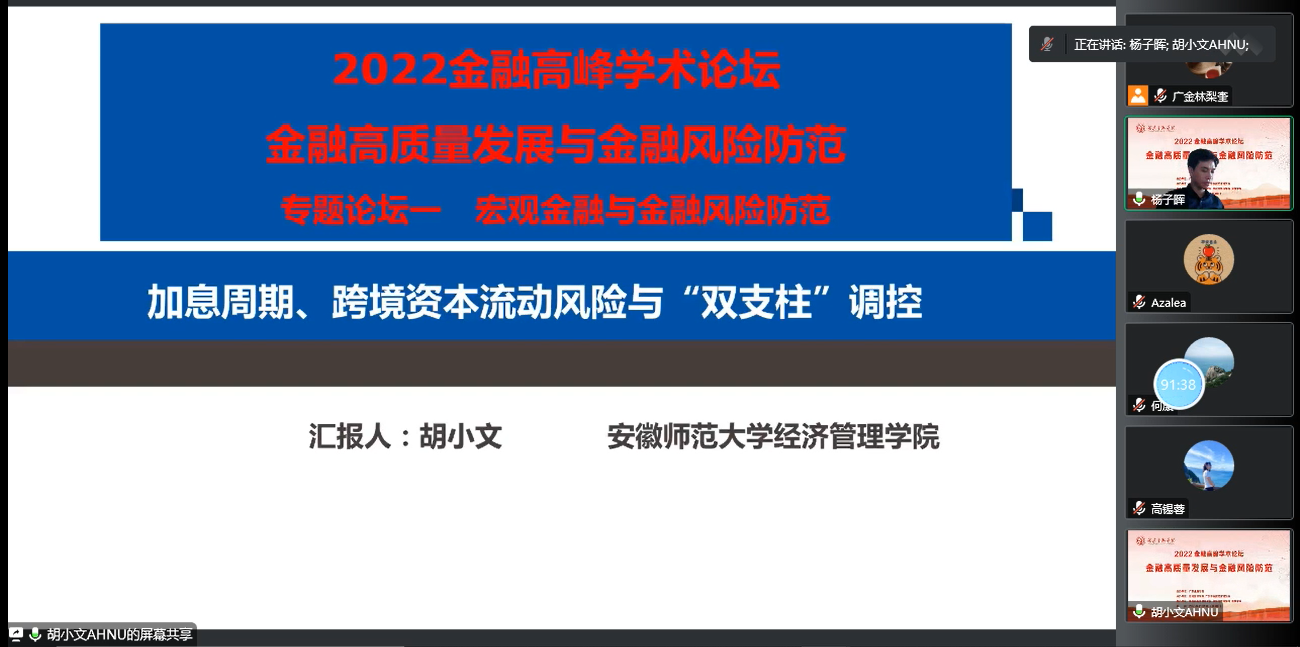 2022年11月13日下午,beet365通过腾讯会议线上举办了2022金融高峰学术论坛之专题论坛一:宏观金融与金融风险防范。该专题论坛邀请了上海财经大学金融公司刘莉亚教授、党委书记,中山大学高级金融研究院杨子晖教授、副经理,以及安徽师范大学经济管理公司胡小文教授、beet365王浩楠博士、华东师范大学经济公司何康博士、暨南大学经济公司高锡蓉博士。嘉宾为听众带来了金融学前沿研究的主题讲座。