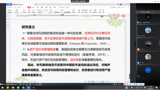 接下来本次学术论坛联合主持人金融工程系阮坚主任邀请毛小丽博士报告自己的学术论文《美国货币政策与中国股市波动》。在经济全球化以及我国资本市场不断对外开放的背景下,毛博士的论文就美国货币政策对我国资本市场的影响开展了研究。钱崇秀博士提出了论文需要改进的一些方向;彭俊华博士从模型的解释变量受否存在多重共线性问题,机理是否需要进一步的补充;黄剑教授通过了解文章的侧重点,对机理进行了补充。三位点评人的思路和逻辑清晰,点评真知灼见。