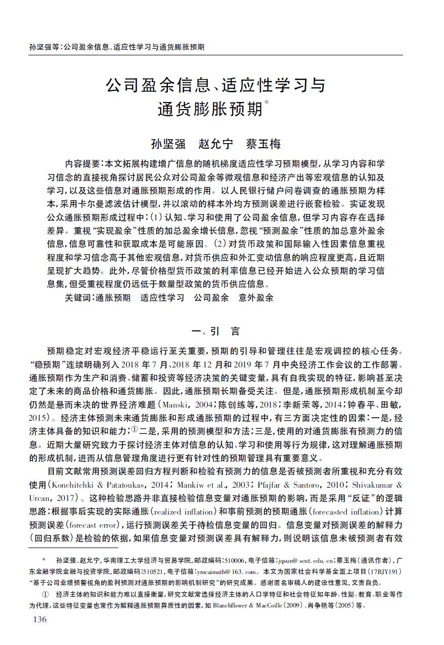 公司金融系教师蔡玉梅博士作为通讯作者,与华南理工大学金融系教授孙坚强、博士生赵允宁合作撰写的学术论文《公司盈余信息、适应性学习与通货膨胀预期》,于2019年10月发表于国内A类权威期刊《经济研究》,这是公司教师首次在该期刊上发表论文。