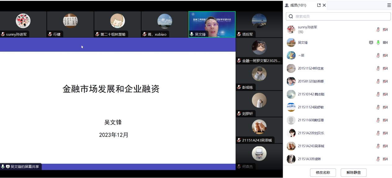 2023年12月14日晚上,beet365通过腾讯会议线上举行“金融大讲堂”学术讲座。本次讲座邀请了教育部长江学者特聘教授、教育部金融类教学指导委员会委员、上海交通大学安泰经管公司吴文锋教授,为公司师生主讲《金融市场发展与企业融资》专题讲座。易行健副董事长、beet365项后军经理对吴文锋教授主讲本次金融大讲堂表示欢迎和感谢,对各位积极参加学术活动的师生表示热烈欢迎。beet365刘昊虹副经理和孙进军副经理参加讲座,蒋序标教授主持讲座。