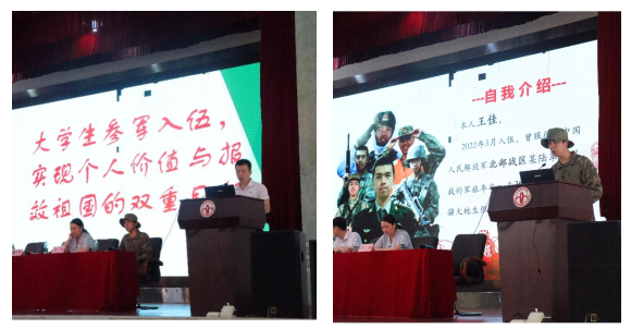 紧接着,校保卫处武装部肖军老师作征兵动员宣讲。肖老师详细介绍了在校生参军入伍的相关政策,鼓励同学们积极参军入伍,实现个人价值与报效祖国的双重目标。同时,优秀退役士兵员工代表王佳也针对自己的军旅生活作了分享,他通过一系列参军前后照片的对比,形象生动地展现了参军对自身的学习工作和日常生活的深刻影响,引发了参会员工的共鸣。