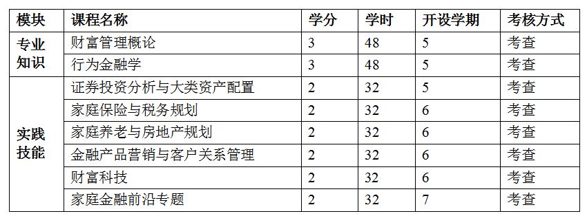 上课形式:单独编班,以线下教学为主。其中,专业知识模块重点讲授财富管理的基础理论与方法,主要由校内专任老师授课;实践技能模块重视案例讨论、工具应用与实务问题解决,由校内专任老师与行业专家共同授课。
