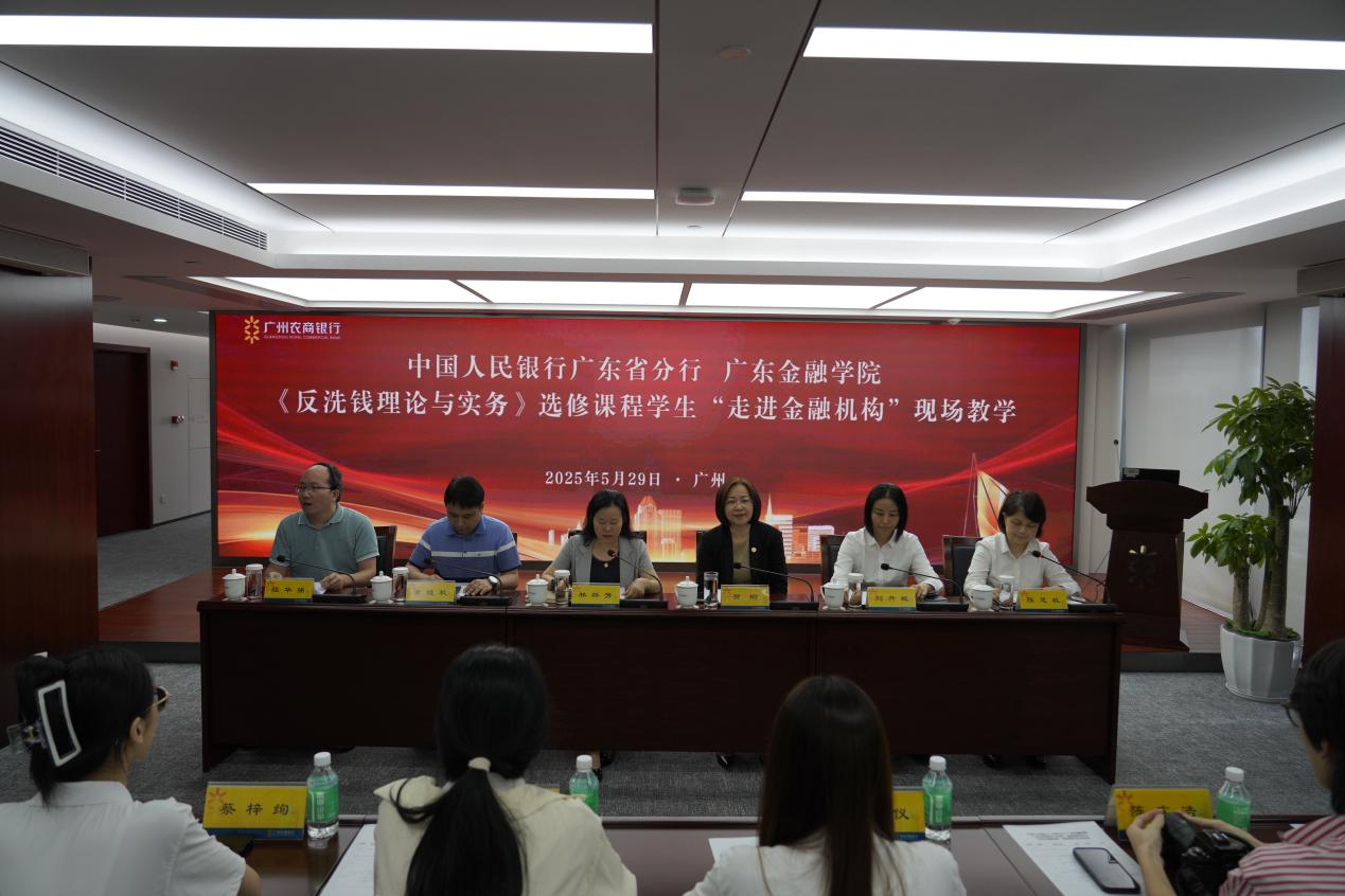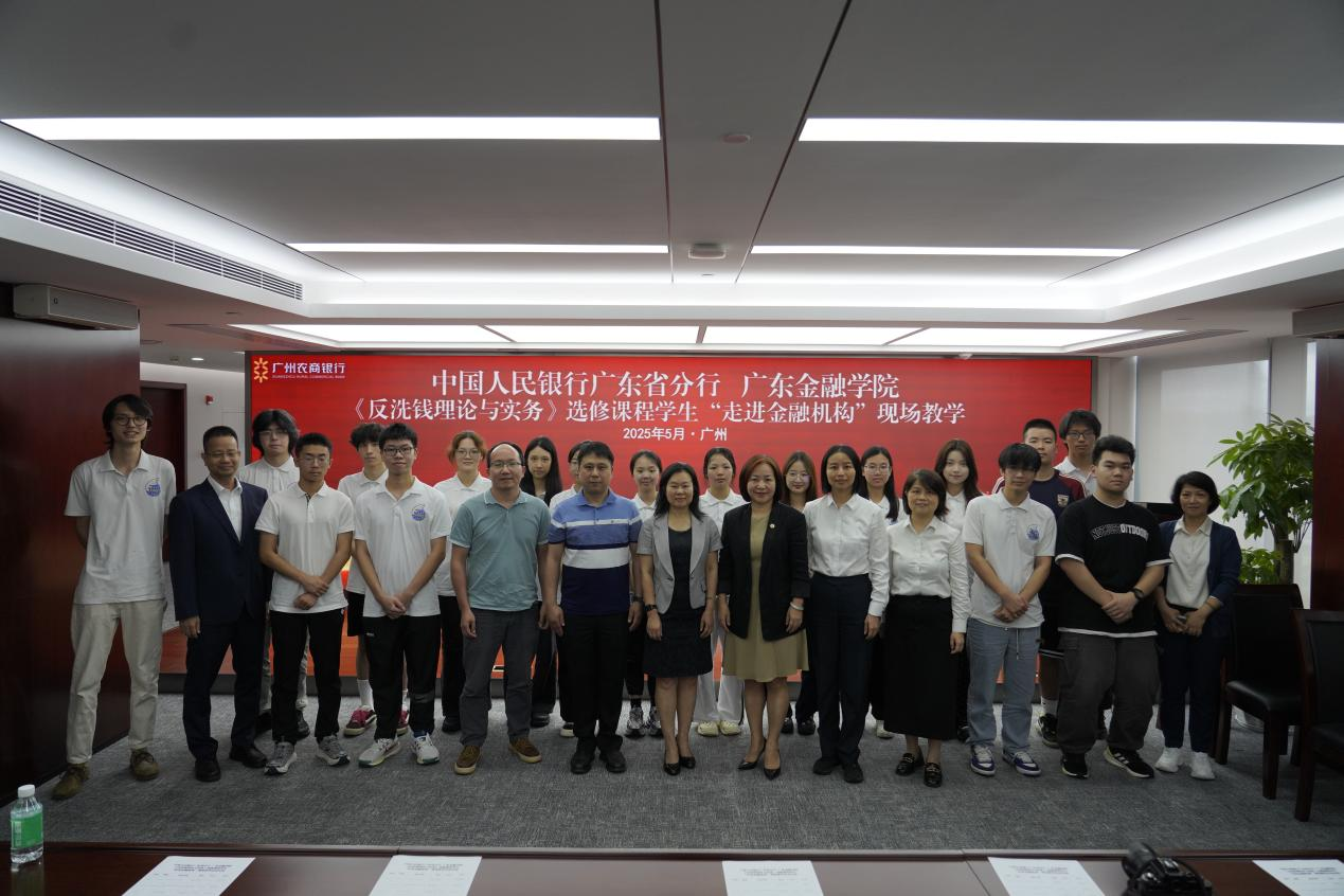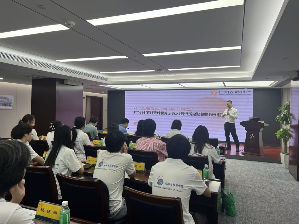 最后,师生们还进行了课堂教学。广州农村商业银行总行合规法律部(反洗钱中心)廖建平经理有着丰富扎实的反洗钱一线工作经验和知识,他在会议室为师生们讲授主题为《从“合规导向”到“基于风险”——广州农商银行反洗钱实践历程》的讲座,深入浅出地讲解了广州农商银行反洗钱合规、反洗钱风险监控、反洗钱信息系统三方面的工作建设,并和员工们就反洗钱工作数字化转型进行了探讨。
