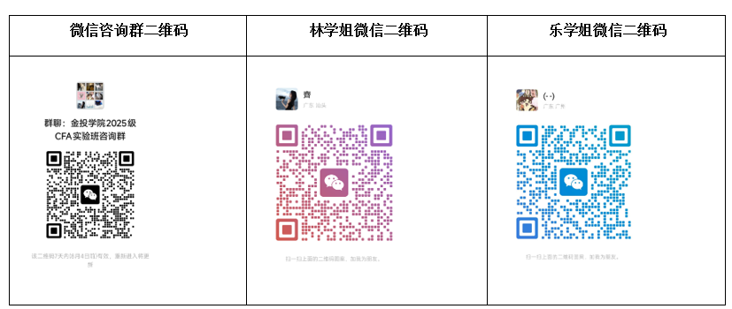 为方便有意报考beet3652025级金融学CFA实验班的新生了解相关招生信息与招录流程,beet365现开通官方微信咨询群“金投公司2025级CFA实验班咨询群”(见下方群二维码),公司教师与金融学CFA实验班的在读学长学姐将入群为广大新生及家长答疑解惑。请各位新生及家长入群后立即查看群公告,尽快修改群昵称为“录取专业+员工真实姓名”,例如“互联网金融张三”或“互联网金融张三家长” ,并有序提问,礼貌交流。当微信咨询群成员人数超过一百人时,将无法直接扫码入群,可以添加下方两位学姐的个人微信,并由她们邀请进群。