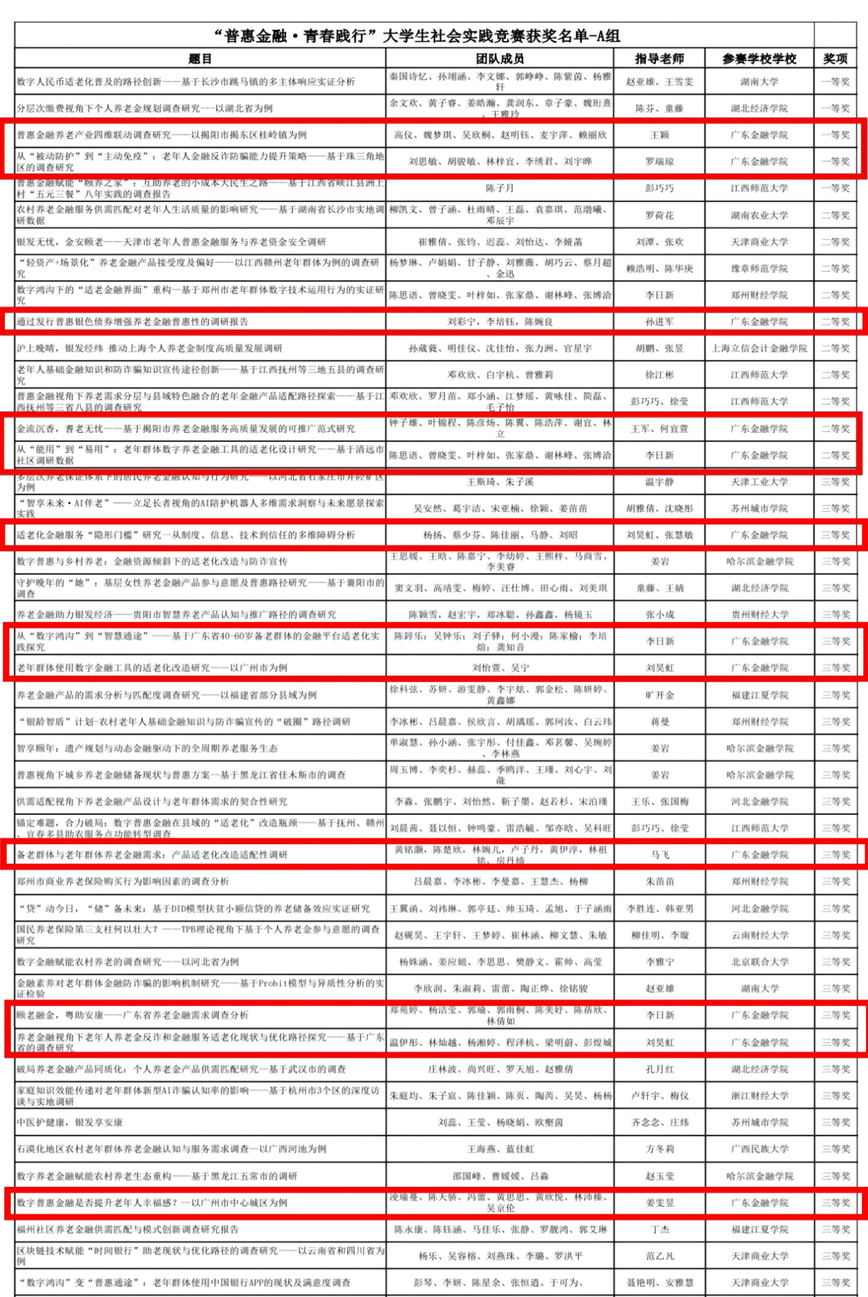 其中,由王颖老师指导的《普惠金融养老产业四维联动调查研究——以揭阳市揭东区桂岭镇为例》团队,深入粤东乡镇调研养老金融服务链条,通过“客户+产品+风险+征信”四维联动模式,为县域养老金融服务体系建设提供了可复制的实践样本,荣获全国一等奖。