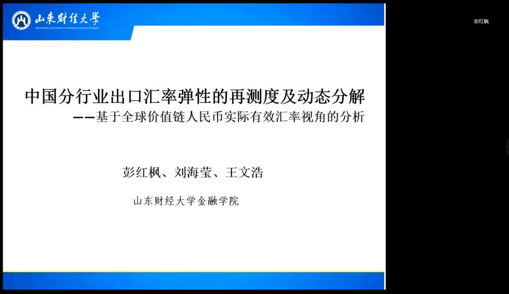 彭红枫教授为公司教师做了题为《中国分行业出口汇率弹性的再测度及动态分解》的主题讲座,从全球价值链人民币实际有效汇率视角,详细介绍了我国各个行业实际有效汇率变动对双边贸易中出口的影响,以及在考量全球价值链影响下对分行业出口汇率弹性的重新测度。彭红枫教授现场解答了项后军、张纯威、陈雷等多位教师关于变量测量、样本选择、数据分析、理论逻辑等方面的问题。