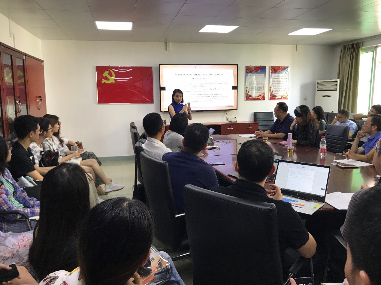 工作坊开始,主持人李欢丽副教授对各位老师和员工的积极参与表示欢迎和感谢,同时对两位老师的简历做了简单的介绍。Tan Ai Lian博士为第一报告人,报告主题——《马来西亚政府债务是否影响了私人投资》,研究特色在于寻求能够促进私人投资的马来西亚政府债务上限。报告完毕后,李琰钰博士从理论机制、实证方法、变量研究等方面对Tan Ai Lian 博士的论文进行点评并提出修改意见。章力老师和丁树老师等也分别与Tan Ai Lian博士交流了隐形债务数据处理和最优债务率的问题。