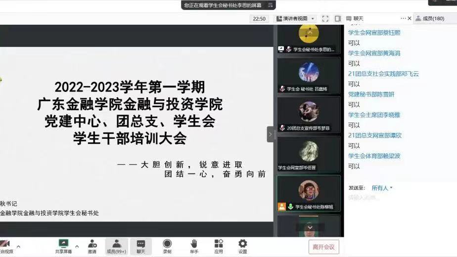 为了进一步提高公司员工干部的综合素质,增强自我教育、自我管理、自我服务的意识,切实提高干部的工作能力和工作效率,beet365于2022年10月17日在线上召开2022-2023学年第一学期党建办公室、团总支、员工会员工干部培训,本次培训由beet365黄镜秋副书记主讲。