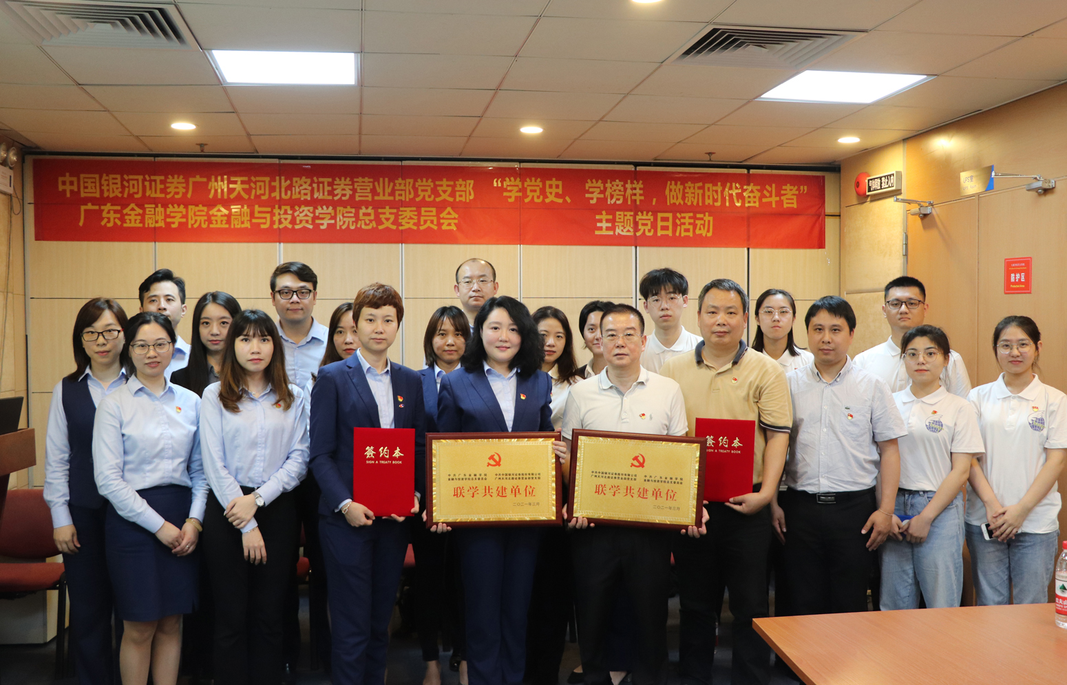 3月30日下午,公司党总支与中国银河证券广东分公司基层党组织联学合作协议签约仪式在广州天河北路证券营业部举行。广东分公司党委委员、副总经理,广州天河北路证券营业部党支部书记、总经理史楠、公司党总支书记周少龙、公司党总支副书记胡小波等领导老师出席签约仪式。签约仪式由副书记温妮同志主持。公司党总支与中国银河证券广东分公司双方党组织负责人签订《党组织共建共联倡议书》并互授联学共建牌匾。