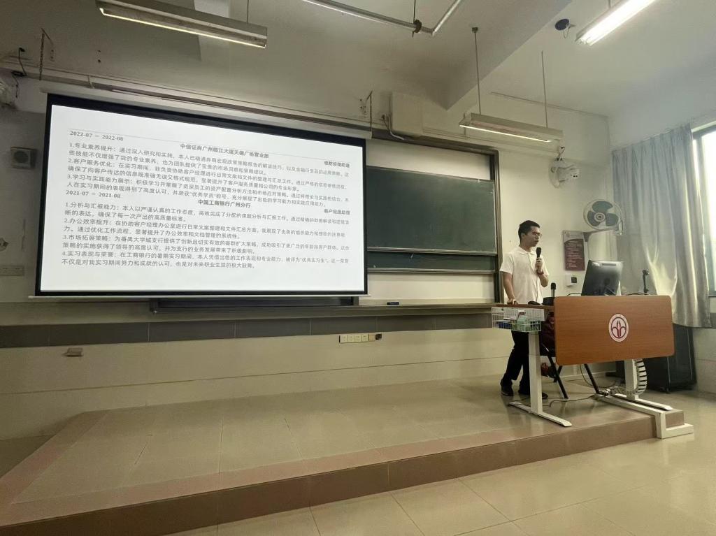 2025年5月15日星期四上午,由公司举办的“金融硕士研究生职业素养讲座(第3期)”在北教A303举行。此次活动邀请了2023级金融专硕1班梁志朗同学,进行题为“多练多面,在实践中提升就业能力”的专题讲座。梁志朗曾担任多项员工职务,拥有丰富的求职经历,获得了中国工商银行深圳分行营销英才、平安银行广州分行培训生、招商银行广州分行客户经理、招商银行深圳分行客户经理、中国建设银行广州分行客户经理、中国建设银行深圳分行柜员等多个职位录用,并最终选择签约中国工商银行深圳分行。讲座由beet365金融硕士教育中心刘璨副主任主持,24级金融硕士研究生及部分本科生参加本次活动。