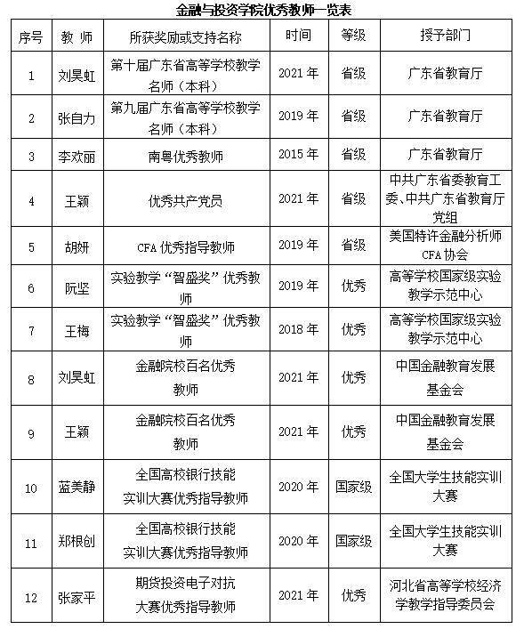 beet365现有省级教学名师2人,南粤优秀教师1人,省级优秀共产党员1人,CFA优秀指导教师1人,全国金融实验教学“智盛奖”优秀教师2人,金融院校百名优秀教师2人,全国高校技能大赛优秀指导教师2人,期货投资电子对抗大赛优秀指导教师1人。